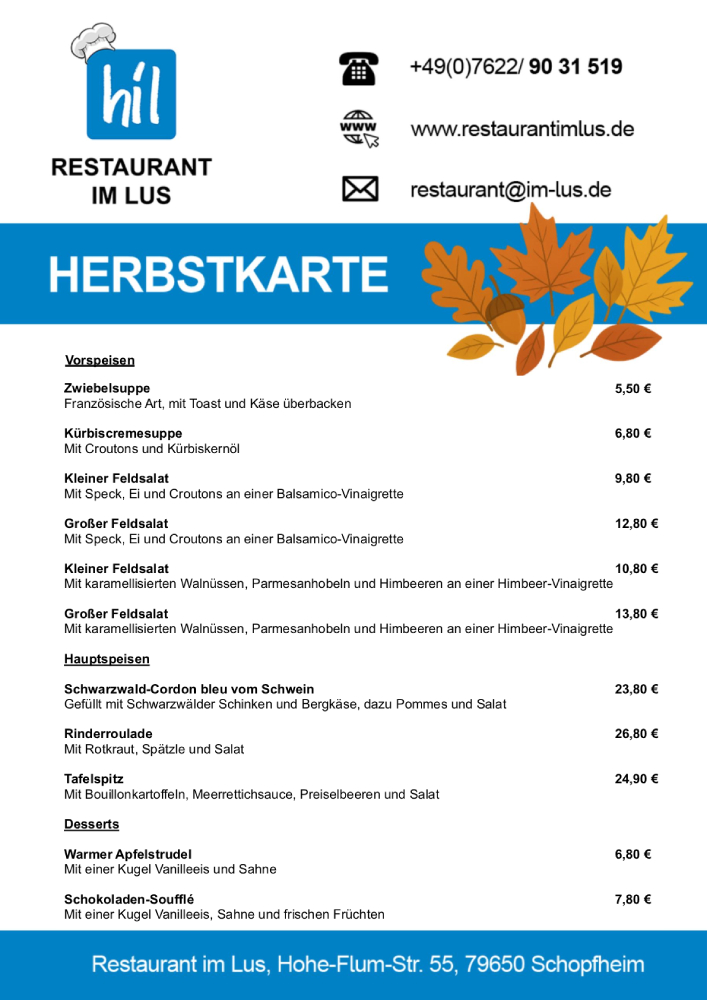 Seit dem 24. Januar 2025 lädt das Restaurant im Lus unter der neuen Führung von Betreiberin Frau Melanie Suleiman und ihrem engagierten Team zu kulinarischen Genüssen ein. Bei uns stehen Frische, Regionalität und Saisonalität im Fokus – alle Gerichte werden täglich mit hochwertigen Zutaten frisch zubereitet.