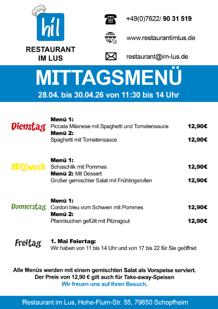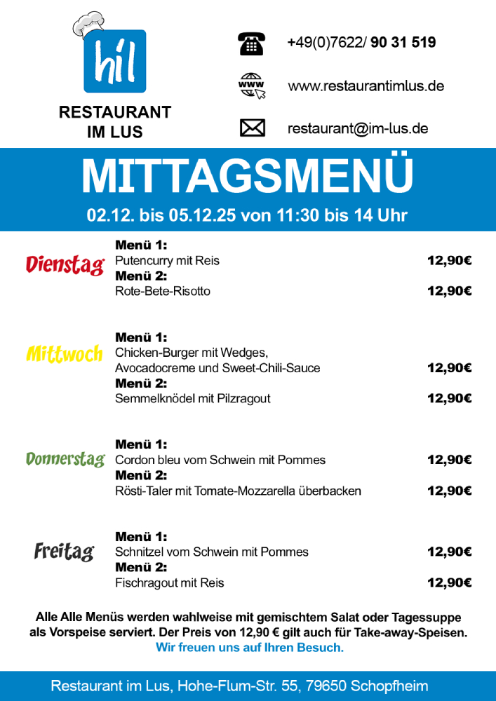 Von Dienstag bis Freitag bieten wir ein täglich wechselndes Mittagsmenü zwischen 11:30 und 14:00 Uhr, ideal für eine genussvolle Mittagspause.